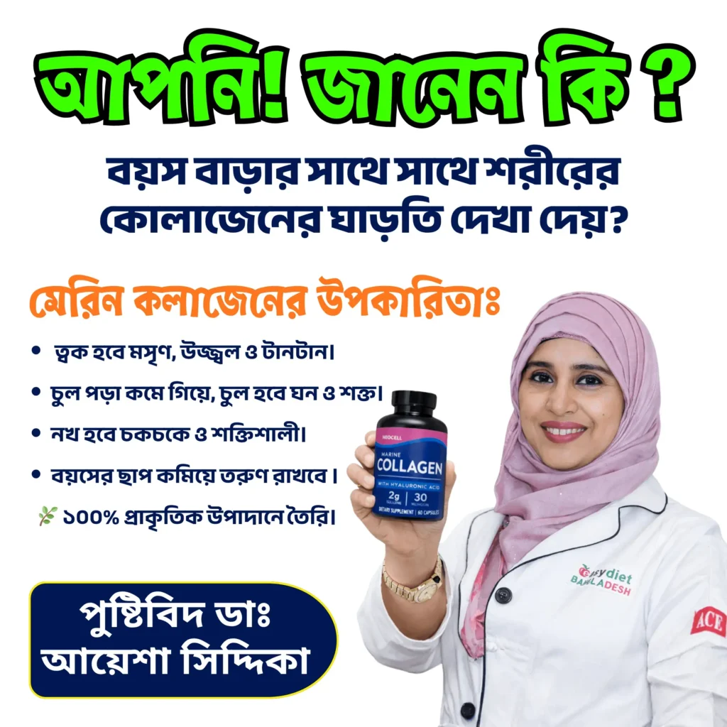 "মেরিন হালাল কোলাজেন সাপ্লিমেন্ট একটি পরম যত্নের স্পর্শ “যা আপনার ত্বকের প্রতিটি স্তরে পৌঁছে তার প্রকৃত সৌন্দর্যকে উন্মোচন করে“ বয়স বাড়ার সাথে সাথে কোলোজেন ফাইবার কমতে থাকে এবং যে সমস্যা গুলো হয়ে থাকে যেমন ত্বক, হাড়, পেশি, ‘টেন্ডনস’ ও ‘লিগামেন্টস’বাত ব্যাথা চুল পড়া রোদ বা চুলার তাপে স্ক্রিনে স্যাঁতসেঁতে বর্ণ স্কিনের রিংকেল এলার্জির কালো দাগ পেটে মাতৃত্বের দাগ বের হয় এবং হাত পায়ের কনুইতে ব্যাথা হয়ে থাকে এগুলো স্থায়ীভাবে রিমুভ করতে কোলাজেন এর গুরুত্ব অপরিসীম ।